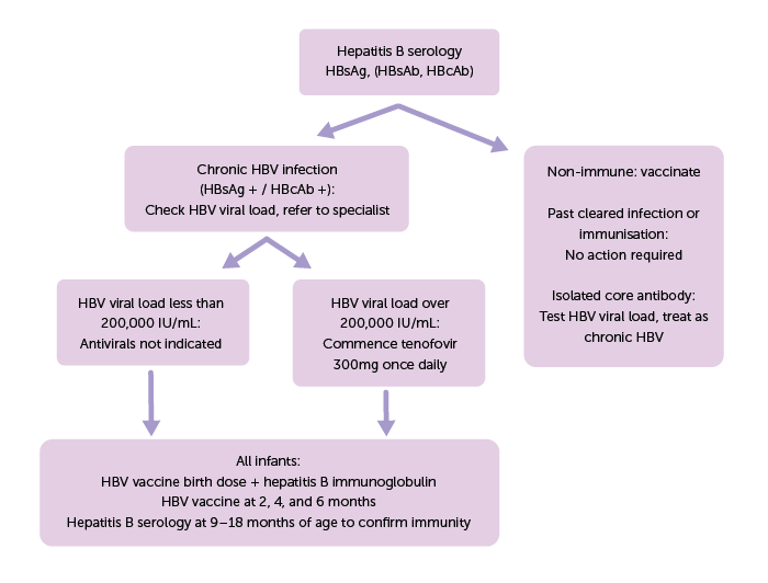 All antenatal women diagnosed with hepatitis B should be referred for specialist review to guide perinatal management. HBV viral load testing should be performed in every pregnancy, and if over 200,000 IU/mL it is recommended to commence antiviral therapy, usually with tenofovir disoproxil fumarate (TDF) 300mg once daily.4 This should be started between 24 to 28 weeks gestation and continued postpartum until specialist review.4 This approach effectively reduces viral load and lowers the risk of perinatal transmission.2 TDF is safe to use in both pregnancy and breastfeeding mothers.1,5