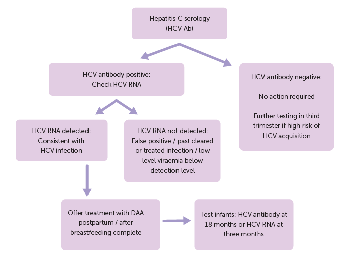 When HCV is detected, this confirms the diagnosis of current HCV infection and specialist review is recommended to discuss the implications for both mother and infant.