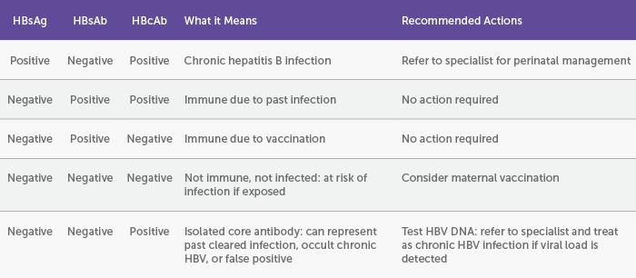 In Australia, antenatal testing includes universal testing for HBV using hepatitis B surface antigen (HBsAg). If HBsAg is detected, further investigations are warranted with hepatitis B surface antibody (HBsAb) and hepatitis B core antibody (HBcAb).3 These results are used to distinguish between those who have chronic infection, those with past cleared infection, and those who are immune from vaccination or have neither been infected nor vaccinated (Table 1).